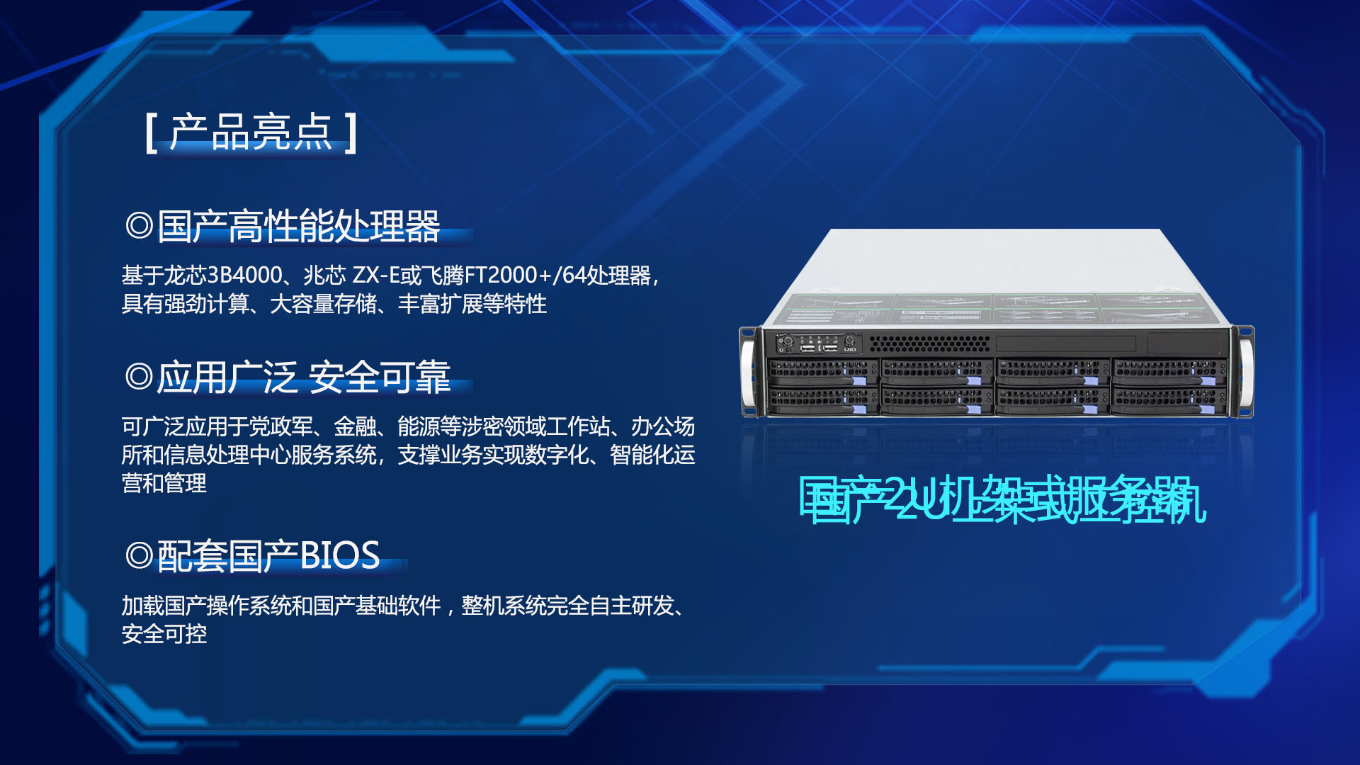 研恒(特控)國產2U機架式服務器基于龍芯3B4000、兆芯 ZX-E或飛騰FT2000+/64處理器,具有強勁計算、大容量存儲、豐富擴展等特性,配套國產BIOS, 加載國產操作系統和國產基礎軟件,整機系統完全自主研發、安全可控。可廣泛應用于黨政軍、金融、能源等涉密領域工作站、辦公場所和信息處理中心服務系統,支撐業務實現數字化、智能化運營和管理。